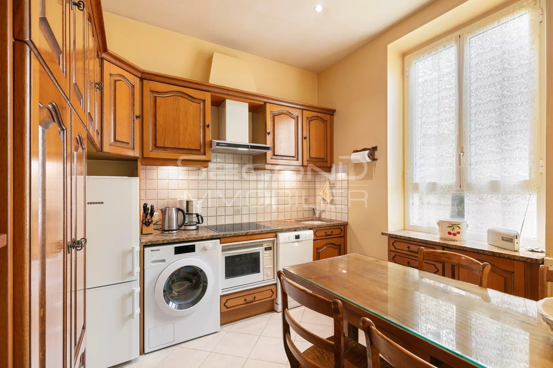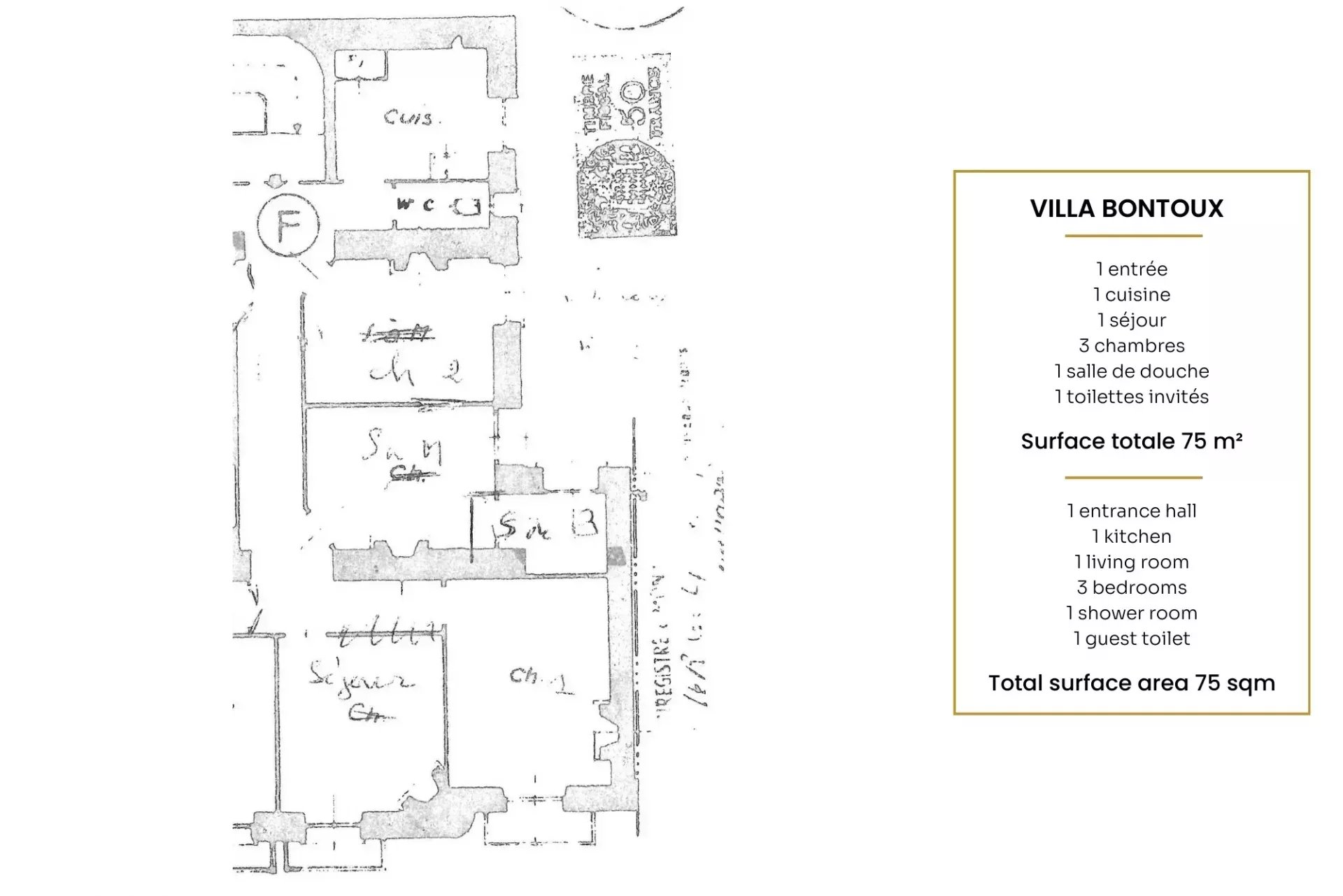 L’espace intérieur se compose d’un hall d’entrée avec placard, d’une cuisine indépendante équipée avec fenêtre, de toilettes invités avec fenêtre, de trois chambres, d’une salle de douche, ainsi que d’un séjour lumineux constituant un véritable espace de vie convivial.